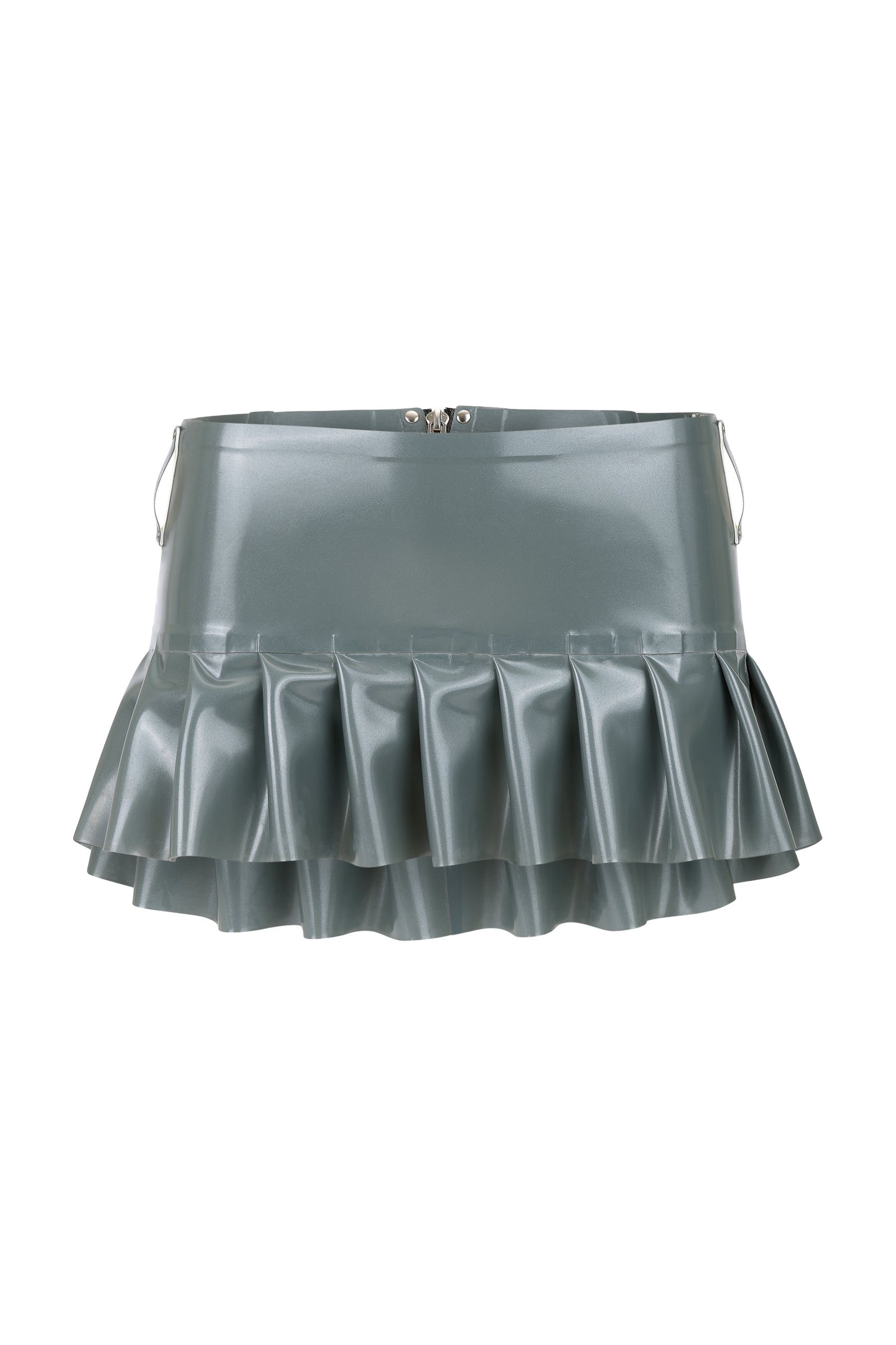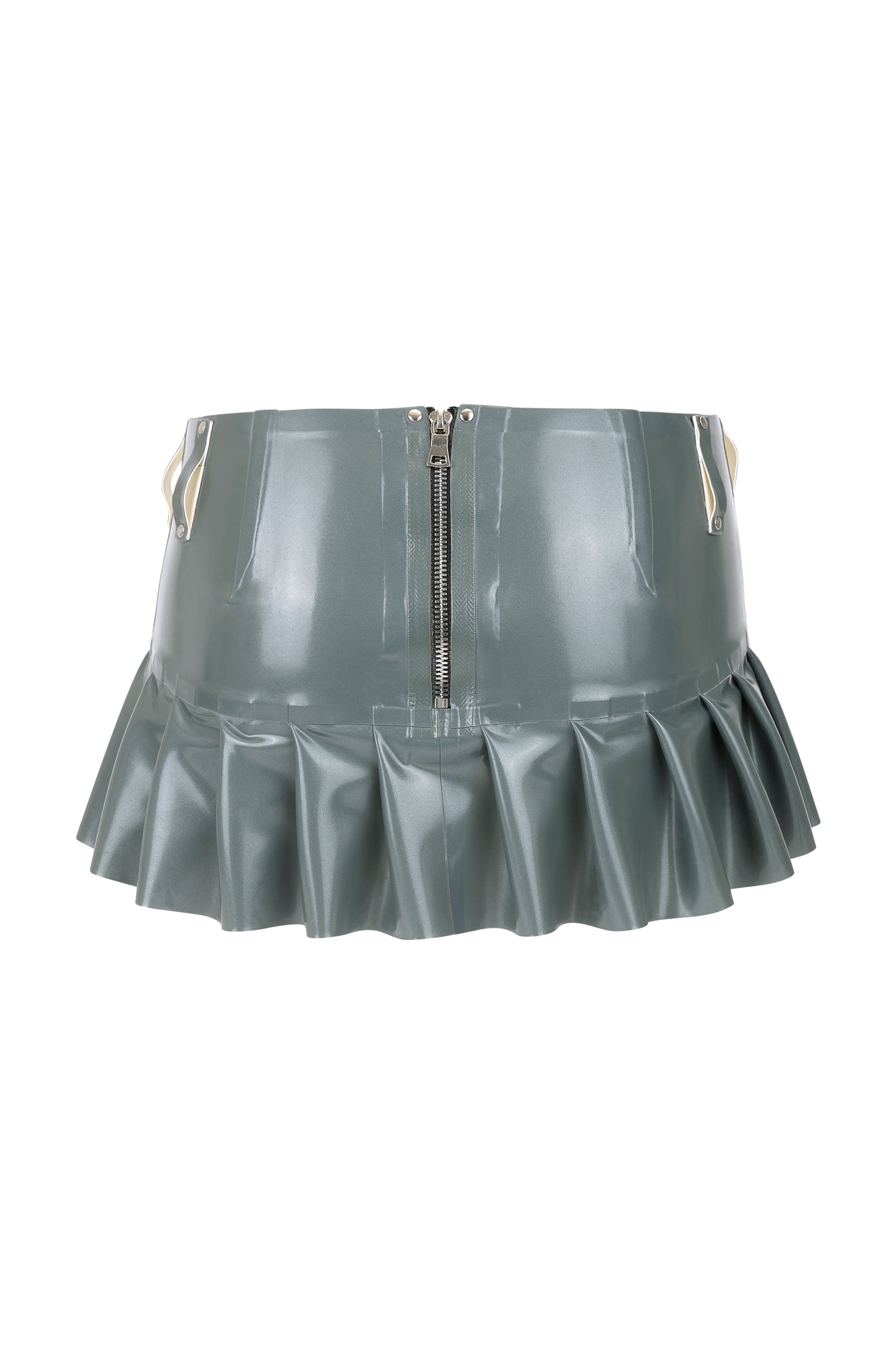 Pleated micro skirt in 100% latex. Belt loops at front & back. Darts at back waist. Zipper entrance at back. Stud detail throughout. Made in Los Angeles