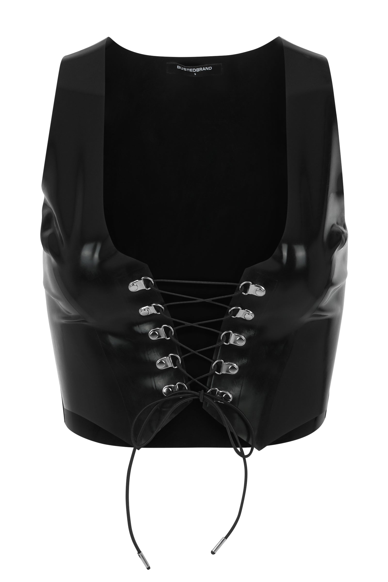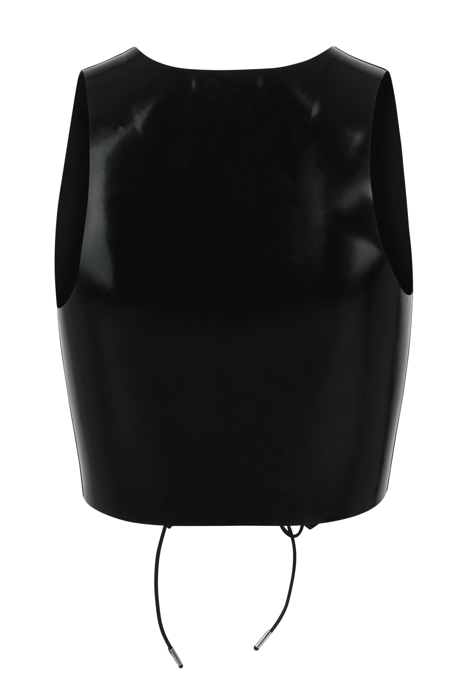 Vest top in 100% latex. Metal D ring attached by rivet at center front. Adjustable elastic lace ties. Contouring bust panels next to skin fit. Made in Los Angeles.