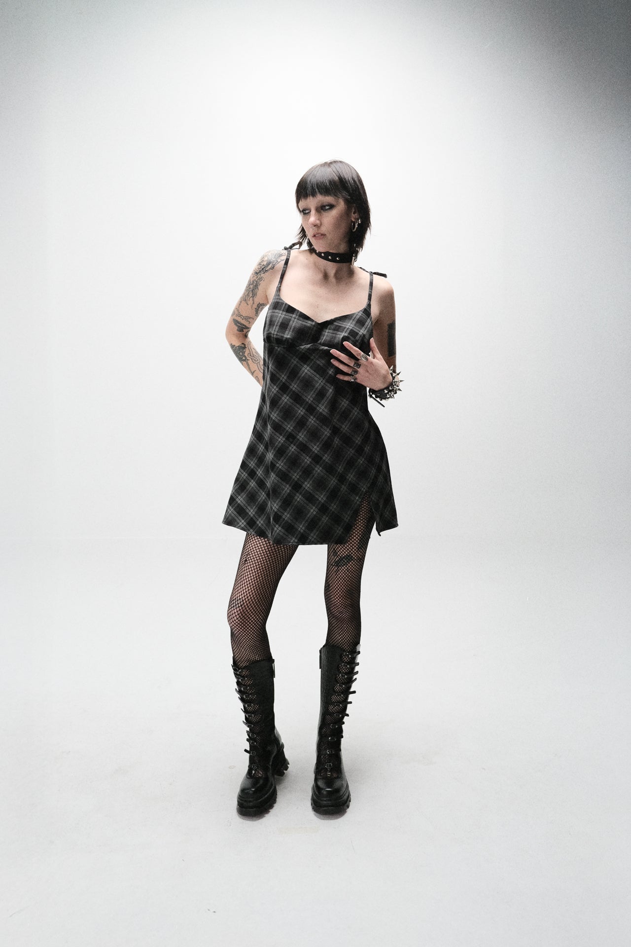 Slip dress in dead stock wool blend. Bias cut. adjustable shoulder straps. Chain and hardware side straps. Leg slit detail on front. Designed with pleated cups. Made in Los Angeles.