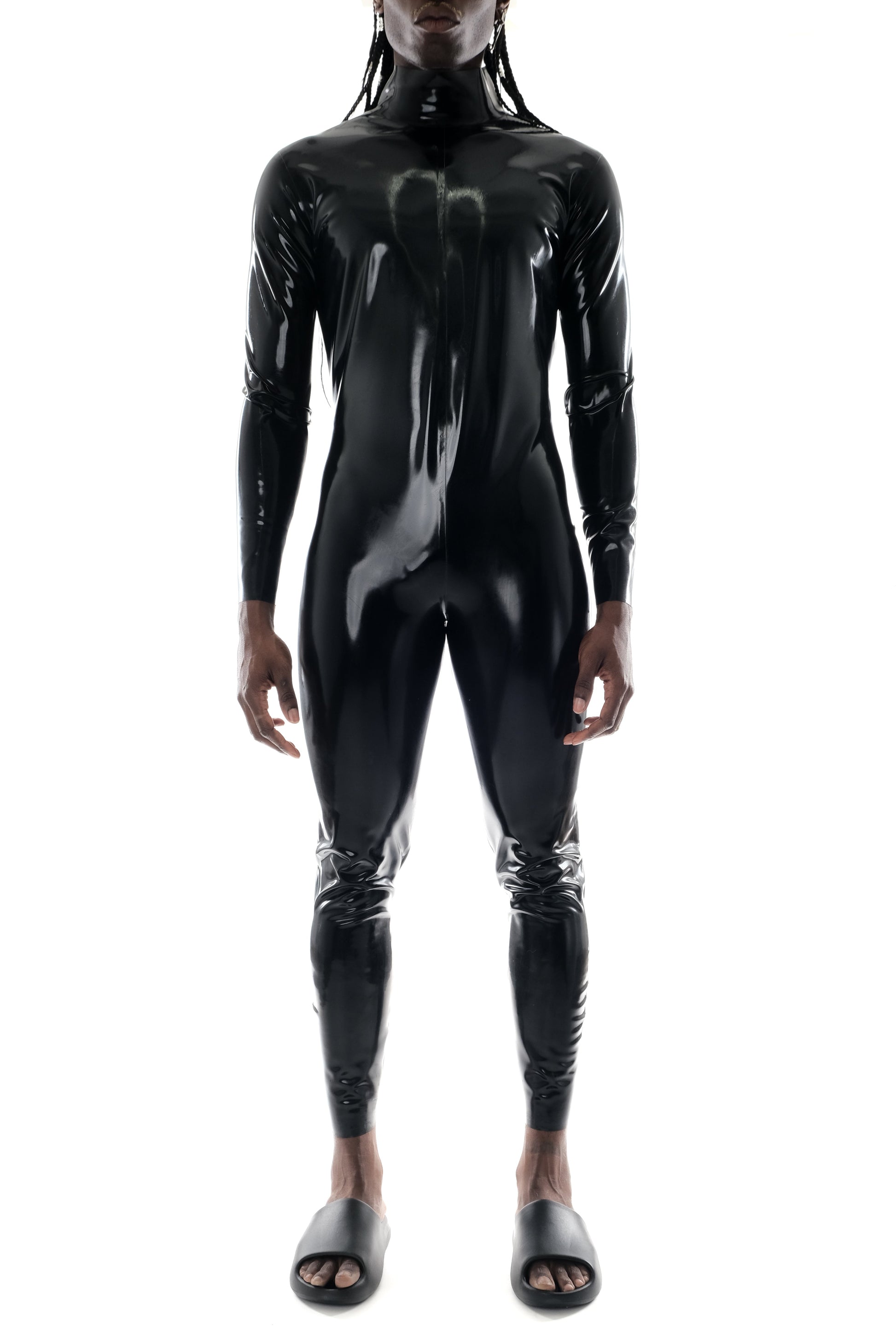 Mens catsuit in 100% latex. Mock neckline. zipper at center back. contouring panels for next to skin fit. Made in Los Angeles