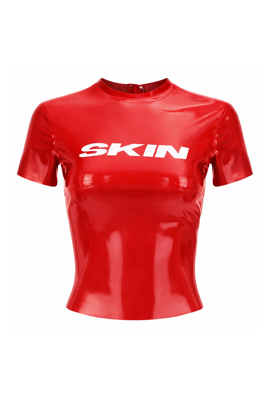 Second Skin Tee in 100% Latex. Bold text at chest. Fitted cap sleeve. Slim through body. Zipper entrance at center back. Stud detail throughout. Made in Los Angeles