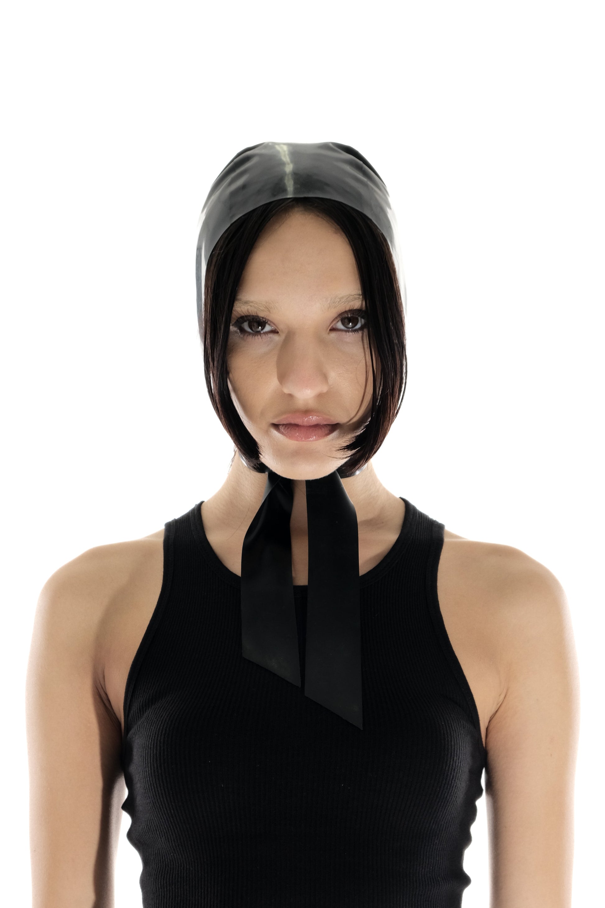 Hood in 100% latex. neck tie closure at front. Made in Los Angeles
